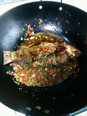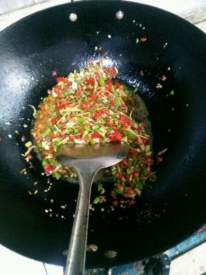 将鱼乘出,剩下的油炒姜蒜,姜蒜爆香放辣椒翻炒