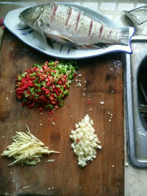 将鱼处理好撒两面洒上盐,青椒红椒小米椒切碎备用,蒜切碎,姜切丝