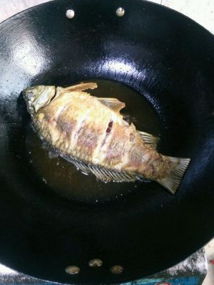 另起锅放少量油,放葱姜蒜末入锅爆香 放煎好的鱼,再把调好的调味汁倒入,加一碗热水没过鱼身