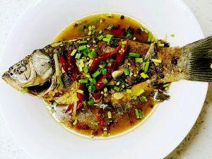 鱼身上色后再翻个面,加葱花就可上桌了!