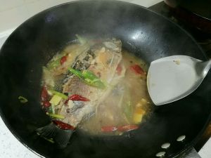 加入水,再倒入适量料酒、生抽、醋、盐、冰糖,然后就开始耐心炖鱼吧,炖出香味四溢!