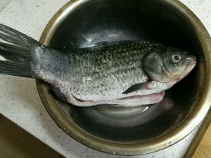 鲫鱼去鳞和内脏洗净,在鱼身上均匀的划几刀,用盐和料酒按摩鱼身,和姜片一起腌制10分钟