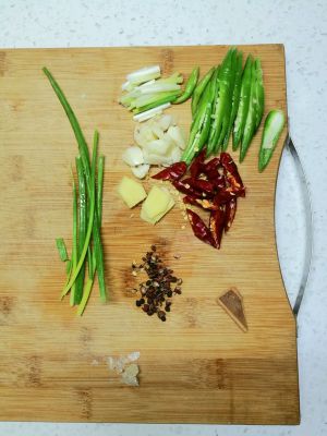 准备好葱姜蒜、尖椒、干辣椒、花椒、冰糖。