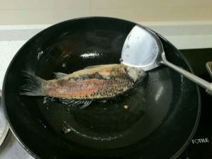 热锅倒入油烧至冒烟下鱼,不要翻动,煎二三分钟后翻面再翻,煎至西面金黄盛出备用。