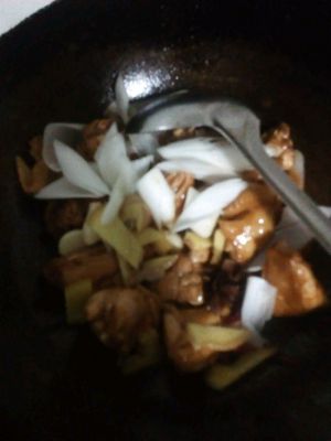 等土豆七成熟放入鸡块,隔一分钟翻炒一次。大火十分钟,放盐和葱丝起锅。