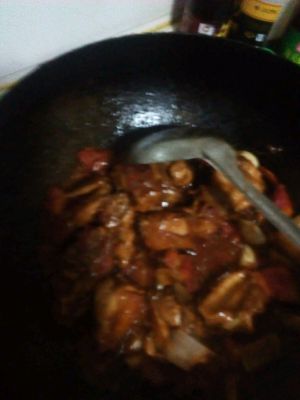 汤汁收得差不多时可以放入青红辣椒炒熟,我没青红椒了,省了,关火,装盘