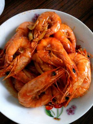 热锅放油,稍多些,油热转小火,下入虾,煎至两面变色,放入葱姜,烹入料酒,将碗汁倒入,盖锅小火烧3分钟
