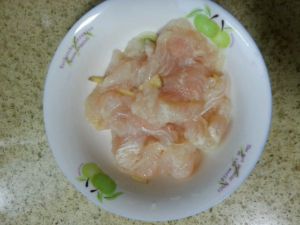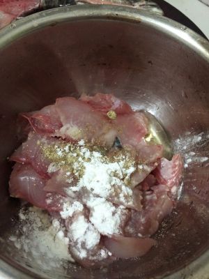 鱼片用盐、黒胡椒粉、生粉腌制一会,