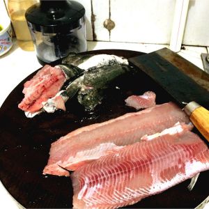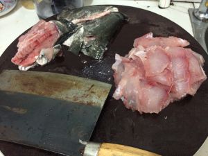 买回家的黑鱼,洗干净,去掉鱼头和鱼骨,准备切片。