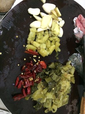 之前准备好的酸菜,泡海椒,小米辣,姜,蒜