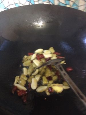 起锅前加入青辣椒,有嫩姜就加嫩姜。