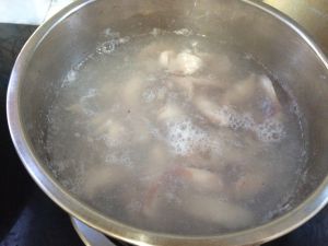 加入鱼头和鱼骨,放入冷水,大火煮开,转小火,吨15分钟。