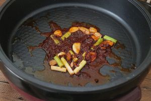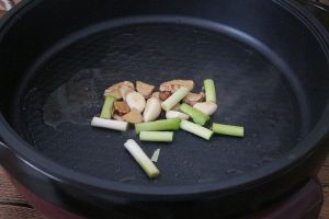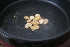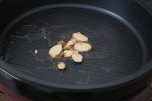 锅里重新加入适量植物油,油热后转中小火,把姜片下入炒香。