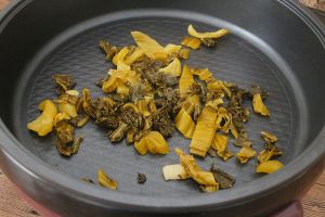把酸菜下入锅里,开小火炒干水份后盛出备用。
