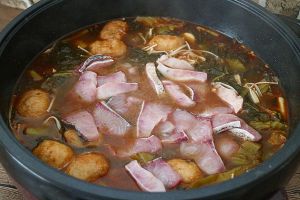 酸菜炒香后加水,把鱼骨和鱼头一起下去煮开后加入腐皮一起煮开