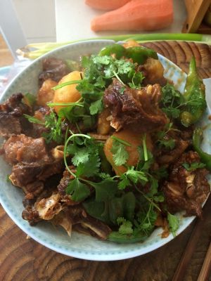 快出锅的时候放青椒把汁收一收,放香菜和香油就出锅了
