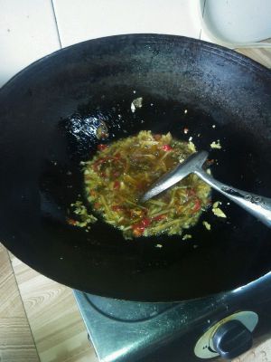 看到锅里冒青烟时放花椒和所有佐料炒香,再下红油豆辨炒出红油