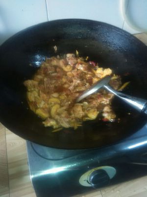 到这里就好下鹅肉的时后了,要不停的翻炒,使肉的表面都粘上佐料,这样肉更入味,开中火烧15分钟左右