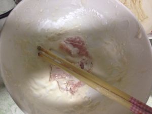 将水淀粉淋在肉片上,让肉片裹上水淀粉,准备开始炸肉了。
