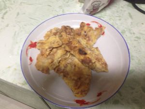 锅里倒油,我用的平底锅煎,油到6成热了,就可以把肉一块一块放进去煎,小心粘一块,等一面金黄以后再翻面