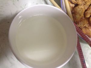 淀粉加水搅匀之后放个20分钟左右,上面就会有一层清水,然后把清水倒掉后,余下的水淀粉会很浓稠,可以拉出长条的感觉,加点油,我们用来包裹肉肉的糊就做好啦^_^