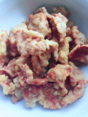 调制淀粉液:干淀粉加入温水调至粘稠,加入两茶勺植物油搅拌均匀。这样炸出来的肉质更松软。重点是要文火慢炸,下锅炸至金黄捞出。这是第一遍,第一遍我们只要炸熟,肉会稍微松软一些。