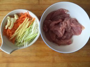 将里脊肉切成片,葱姜切丝、蒜切片、胡萝卜切丝,备用