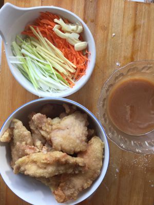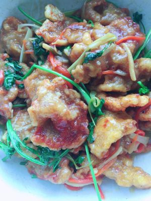 炸好的肉放置一旁,锅里放少量油,放入葱姜蒜爆香,放糖和醋(根据个人口味)放入胡萝卜丝圆葱丝翻炒,放鸡精,盐,酱油,放入炸好的肉,翻炒上色装盘