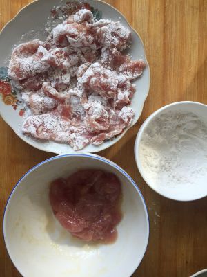 土豆淀粉加水溶解,不要太稀哈,不然肉挂不住淀粉液。