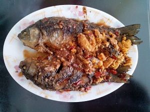 把鲫鱼装盘,备用,泡椒 泡姜切碎,入油锅,炒香后加豆瓣,依次加入生抽和醋,放少糖提味,把鱼放进去,让鱼入味。勾芡起锅!