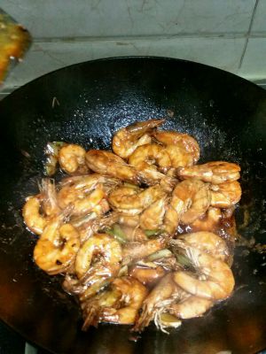 放入生抽老抽和白糖,把虾再次入锅翻炒,放入少量清水,焖制5分钟。