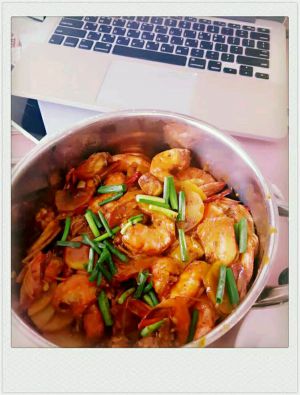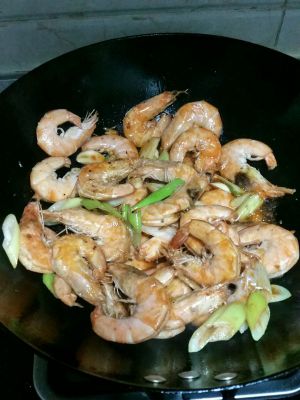 最后放入大虾,大火稍微收汁,撒葱花装盘。