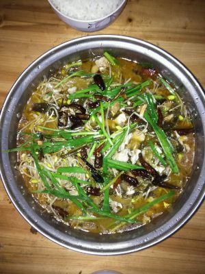 重新起锅热油,把红干椒和花椒放入热油中,爆香把热油倒入已做好的酸菜鱼中,可以开吃啦!(倒热油前放入香菜或韭菜味道更好哟)