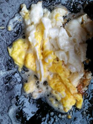 倒入鸡蛋搅拌铲碎,加入一勺盐半勺白糖,出锅啦