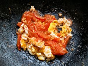 锅中放油将鸡蛋炒至金黄色,没必要全熟,因为过会儿还要和西红柿一起翻炒,否则会太老。出锅备用