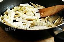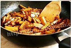 锅里放炒菜量油或者比平时炒菜油量稍多些,把笋放入锅中炒,中大火,翻炒到笋边有些焦黄的感觉最好。