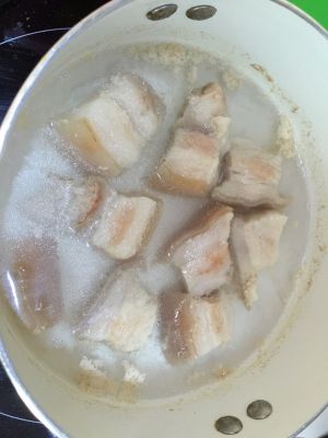先将五花肉切块后倒入锅里的水中煮开去血水,然后过一下冷水