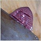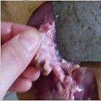 用手抻住白色筋膜的部分,用菜刀一点一点的偏掉所有的白色筋膜(一定要骗掉所有的白色筋膜啊,这个是异味的根源啊)。