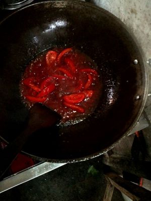 锅中先放入少于植物油,再放入白糖,搅拌后倒入西红柿。再放番茄酱。甜度个人把握。