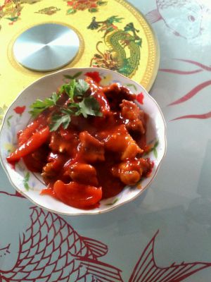 排骨切好 洗好后用适量淀粉加点面粉抓一抓。 锅中油加热到4,5成时,放入排骨煎到两面金黄。