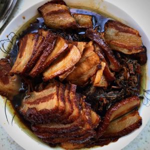 滤掉汤汁在另一个碗里备用,梅菜扣肉倒扣在盘子里,剩余的汤汁勾芡,放点味精提味后浇在肉上即可。