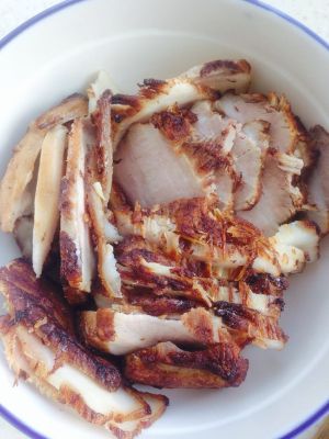 炸好的五花肉切片,厚薄随意,码放在碗里。