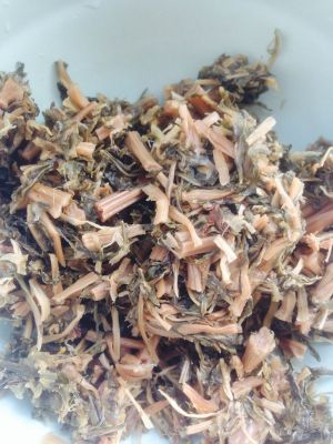 垫锅冷油,依次放葱姜蒜、花椒面炒香,将提前泡好洗净的梅干菜入锅炒香盛出备用。