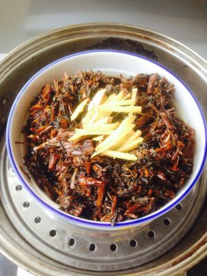 把炒好的梅菜放在切好的肉上,姜切丝,放入大料。盖上锅盖,蒸一小时左右。