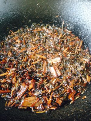 锅热后放油,油热后放入梅菜翻炒。加入老抽、生抽、鸡精、盐、白糖翻炒片刻,加少量热水,微炖一两分钟入味。盐可根据个人口味,适量放入。