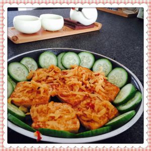 材 料: 豆腐、半斤虾、1.25茶匙盐、1茶匙香油、半匙绍兴酒、1.5茶匙淀粉、新鲜的白胡椒粉、2汤匙生粉、4杯油、 蘸酱:1茶匙糖、1汤匙生抽、¼茶匙黑酱油、葱花