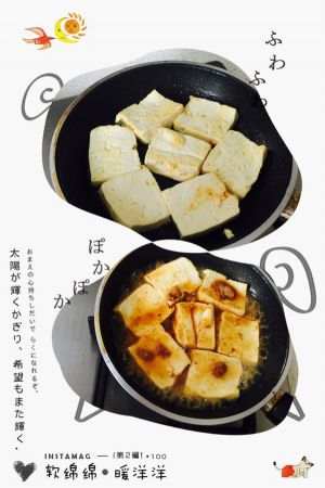 转动锅子,慢慢地煎,至豆腐底部成金黄色,关掉火让锅自然冷却。