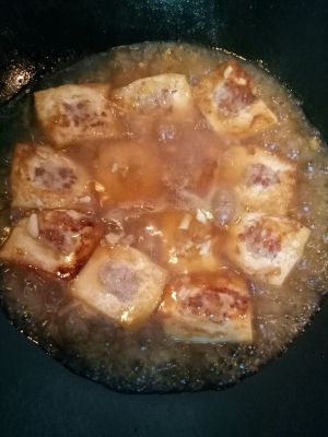 盖上盖,煮开后,改用纹火慢慢地煮至肉馅熟了,加少许生抽起锅。这样煮出来的酿豆腐嫩滑鲜美。若与一碗大蒜辣椒酱佐餐,味道更是好极了。