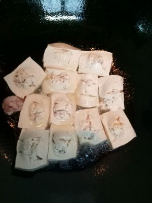 往小孔里小心地塞满肉馅,多多的塞。注意用手指“保护”好豆腐免得撑破了。