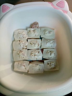 2、取出嫩豆腐,排出多余的水分,切块,朝上的一面轻轻地用勺子挖一个小坑用来放虾肉,舀起虾肉末,蘸取淀粉后置于豆腐上。